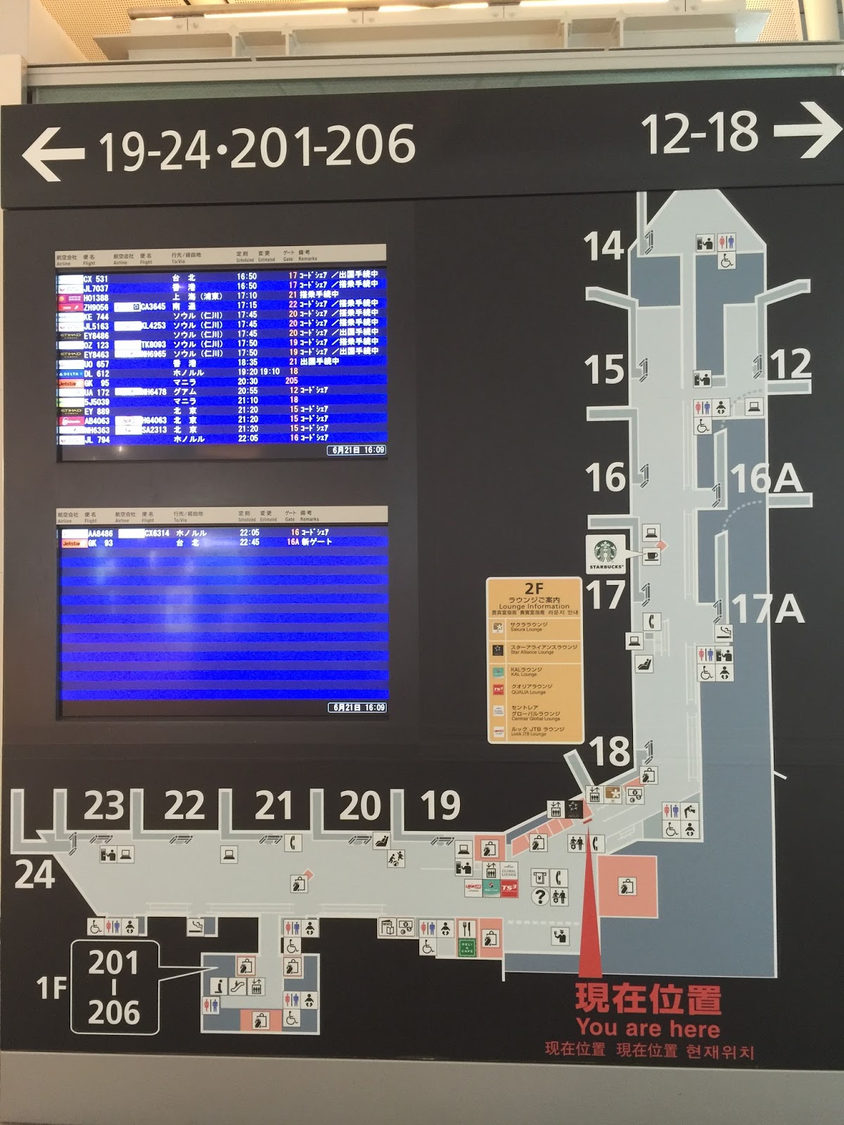 スタバは、国際線搭乗ゲート16と17の間の辺にある。